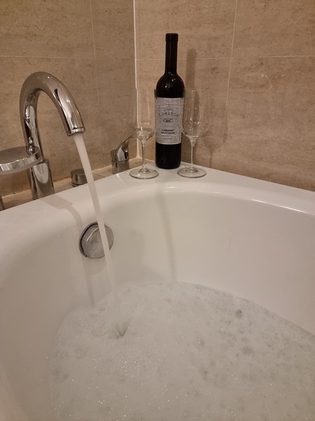 Na het avondeten in het restaurant, kochten we in een promotie twee flessen wijn en gingen we naar kamer. Daar namen we heerlijk de tijd voor een bad, met een flesje wijn. Iets waar wij zo van kunnen genieten. Nakletsen over de dag, over onze plannen hier en alles wat nog verder in de toekomst ligt. De fles wijn smaakte ons goed en sliepen als een roos in het heerlijke bed.