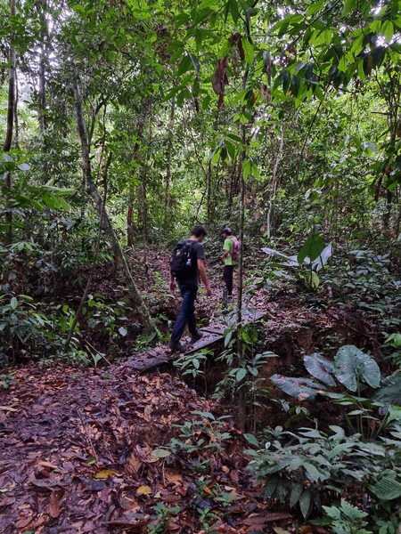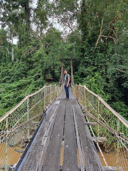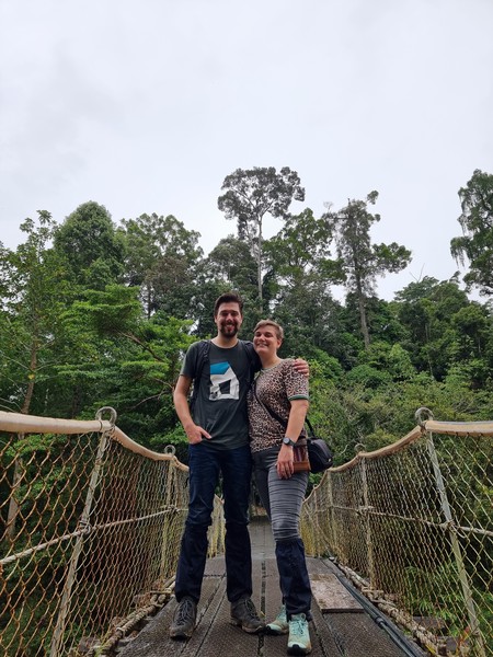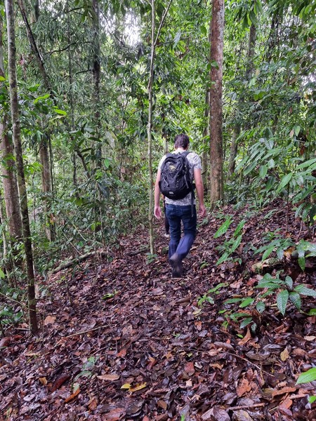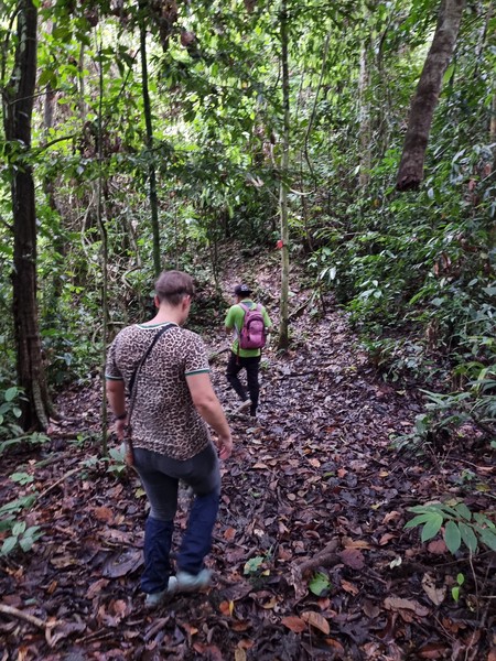 In de ochtend belde we met Martijn en Belén, om het nieuws over Pochi met elkaar te delen en een beetje plannen te maken over hoe en wat. Daarna namen we een Grab naar de plaats waar we opgehaald zouden worden om naar Danum Valley te gaan. Gisteren hebben we dit stuk gelopen, maar naast dat het geen makkelijke weg was om te lopen, doordat je vooral langs grote wegen liep zonder stoep of iets dergelijk, is het ook gewoon bloedheet om met de tassen op een halfuur te lopen. De plek waar we aankwamen met de bus is eigenlijk ook de plek waar het vliegveld (met de grote van een busstation) is en dus ook alle kantoortjes van de activiteiten die je vanuit hier kan doen. We besloten ook direct om de volgende nacht die we moeten gaan doorbrengen in Lahad Datu in dit “centrum” te doen. We lieten ons afzetten bij een koffietentje in de buurt en ontbeten daar wat. Hilde liep tussendoor nog even naar het hotel verderop, om daar te vragen of het mogelijk was om daar te komen slapen over 4 dagen. Vervolgens liepen we naar het kantoor van het Field Center van Danum Valley. Hier moesten we om 12 uur zijn, zodat we optijd naar Danum zouden gaan. We moesten een zelftest daar doen om dit te kunnen laten zien en allerlei papieren invullen. Uiteindelijk vertrokken we pas om 3 uur, omdat er allerlei miscommunicatie was én een gat (letterlijk) in de weg ernaar toe.