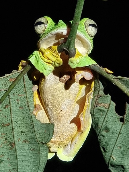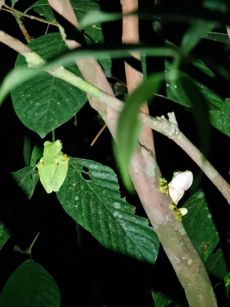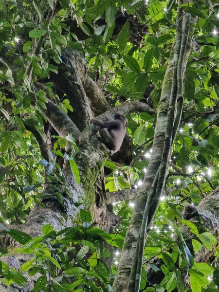 In plaats van met de jeep gaan we deze avond gewoon met de benenwagen de jungle in. ’s Avonds heb je blijkbaar minder last van de bloedzuigers wat het ook wel iets relaxter maakte om te lopen (al hadden wij wel gewoon onze sokken aan, om geen “vieze” risico’s te lopen). We beginnen samen met onze ranger maar al snel lopen we met meerdere toeristen en gidsen in een grote groep door de jungle heen. Voor het eerst in Richards leven komen we daar ook een tarantula in het wild tegen, die tegen de boom aan geplakt zit. Wat denk je? Super schuwe beesten zijn het blijkbaar. Het was op enige afstand dat we hem zagen en bij de minste beweging verdween die ook in de boom. Wel erg gaaf om gezien te hebben. Sommige rangers hebben dan ook een verrekijker bij zich waarmee je ook op afstand kan kijken alsof je er naast staat, die we op dat moment ook even konden lenen. Verder hebben we deze avond grote groene kikkers gezien en een civet in de verte. Wat we ook veel tegen zijn gekomen, maar liever eigenlijk niet te lang tegenkomt, zijn fire-ants. Dit zijn mieren waarvan de beet vergelijkbaar is met een wespensteek, maar dan meerdere keren achter mekaar, en van meerdere mieren als je in de buurt van een nest komt. Deze nesten zijn we dus heel veel tegen gekomen. We riepen dan “ANTS!”, rende een stuk totdat we er weer voorbij waren, en stampte hard met onze voeten voor de zekerheid. Wij zijn niet gestoken, maar onze gids had minder mazzel. Al had die er misschien zelf ook voor kunnen kiezen geen lage schoenen zonder sokken aan te trekken…