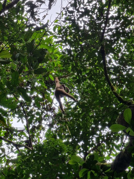 Deze dag beginnen we met een mooie ochtendwandeling. Danum Valley staat bekend om dat je hier goed de Gibbon moet kunnen spotten. De Gibbon is een type slingeraap die zijn hele leven nooit de grond raakt. Ook maakt deze aap een heel bijzonder en herkenbaar geluid, wat over het bos heen galmt. Deze ochtend horen we ook de Gibbon al op aardige afstand en onze ranger van de vorige dag brengt ons ook meer in de buurt. We kunnen vanaf dat punt helaas nog niet veel zien, maar we zien vaag erg hoog in de bomen wel iets van beweging. Gelukkig is daar ook de “Gibbon-ranger” dichtbij ons, een gids van het park die ook onderzoek doet naar deze Gibbons (en specifiek de groep waar we naar aan het kijken/zoeken zijn. Hij weet precies de goeie plekken aan te wijzen om zicht te krijgen op deze bijzondere apen. Het mannetje hadden we snel gevonden, omdat die ook veel geluid maakte, maar later hebben we ook het vrouwtje en een jonge Gibbon kunnen zien. Na de roep van de Gibbon is het een vast ritueel dat deze apen naar een ander gedeelte van de jungle vertrekken en hiervoor ook lager in de bomen gaan zitten, wat ervoor zorgde dat we nog beter beeld van ze kregen. Het was een prachtig gezicht om deze beesten te kunnen zien, zeker omdat we hiervoor nog niet veel geluk hadden gehad met het spotten van dieren in dit park. Hilde was opslag verliefd op deze mooie en bijzondere apen.