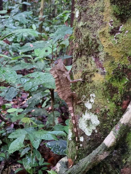 We hebben hier ook nog een bear-cat kunnen zien in de buurt van de Gibbons, wat een type civet is. We werden super enthousiast wat ze gaven aan dat deze civet altijd lastig te spotten valt. Tijdens het aanschouwen van de Gibbons, werden wij goed in de gaten gehouden door een forest dragon. Inmiddels was er nog een ranger aangesloten en die zei lachend, “Oe a dragon here!”. Dus wij een beetje lachend omkijken en denkend dat die een grap maakt over draken die te zien zijn in de jungle. Maar toen zagen we het bijzondere beestje inderdaad tegen de boom aanzitten. Gauw een fotootje van geschoten en weg was die… het werd hem te druk denken we!