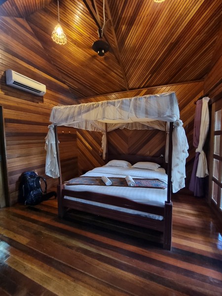 In de ochtend scheen er geen enkel tentje open te zijn voor een ontbijtje… of tenminste, niet wat wij echt zochten. We hadden vast ergens mie kunnen halen, maar we wilde even iets anders. Het werd een aantal gescoorde dingen bij de supermarkt waar we direct ook nog wat muggenspray insloegen. Om 11.45 werden we opgehaald bij een hotel wat 3 minuten lopen was. Een drie uur durende rit naar onze slaapplek in de jungle. We verbaasde ons over hoe een mooi plekje we kregen en genoten helemaal ervan dat we een bad in onze badkamer hadden staan.