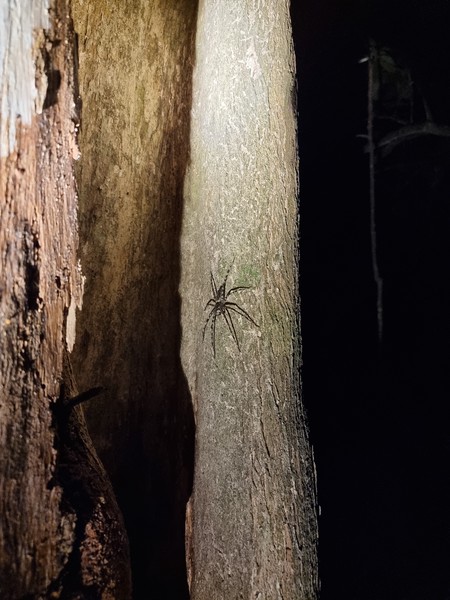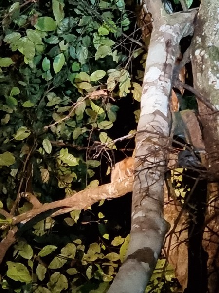 Op dag twee hadden we nog een nachtwandeling, waar we een aatal slapende vogels hebben kunnen spotten en heel dichtbij konden komen. Super leuk om te zien! Daarnaast nog wat verschillende insecten en spinnen. Ryan maakte de wandeling nog wel even spannend doordat hij een verhaal begon over “hoe te reageren als we olifanten tegen zouden komen”. Net daarvoor hoorde we een hoop verschuif in het donker en na een tijdje vuurwerk. Dit vuurwerk werd afgevuurd om de olifanten niet te dicht bij het dorp verderop te laten komen. Ze zijn dus in de buurt, hij vertelde dat hij het niet echt heeft op olifanten… ze kunnen verschrikkelijk agressief zijn namelijk. Oef oke… de verhalen kwamen los over hoe er al weleens mensen waren aangevallen en hoe verschillende gidsen op gevaar reageren. Uit het verhaal kwam in ieder geval dat de gids altijd als achterste moest blijven, tussen de dieren en de gasten. We liepen verder… je moet je voorstellen, in het pikkendonker met alleen een paar lampjes in de dichte jungle… ergens voelde we allemaal de spanning van het feit dat de olifanten dichtbij zouden kunnen zijn. Na een tijdje gaf Ryan aan dat ze niet meer in de buurt waren, hij kon namelijk geen sporen vinden op de plekken waar hij dit had verwacht. Nou deze spannende wandeling sloten we weer af met een biertje, genieten! De gezamenlijke ruimte is eigenlijk een soort buiten, aan de rivier. Wat een heerlijke rust brengt en een fijn plekje is om de dag mee af te sluiten.