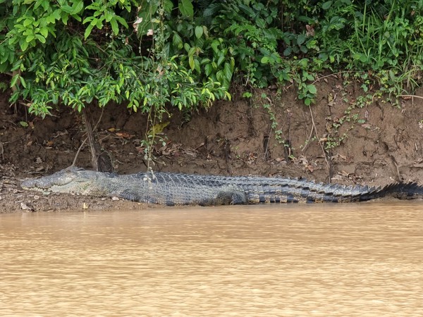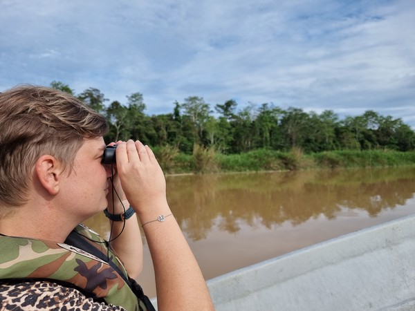 We waren lekker optijd voor de teatime en zagen een ander stelletje zitten. Ze bleken ook Nederlands en we maakte een praatje tijdens een hapje en een koffietje. Om vier uur begonnen we met de tweede middagcruise. Het klikte leuk met het Nederlandse stel en tussen het wild spotten door, hadden we leuke gesprekken. Neusapen, Langur apen en natuurlijk de makaken kwamen langs. Ryan wilde na vijftien minuten upstream varen omdraaien om misschien meer kans downstream te hebben voor de olifant. Hij draaide de boot en zei bijna direct daarna “ELEPHANT!”. We zagen in de verte wat gespetter, maar hadden niet meteen de realisatie dat het daadwerkelijk een olifant was. We kwamen dichterbij en konden hem goed zien. Het was een jonger mannetje en hij was alleen. Hij nam een bad en klom daarna weer de kant op, wat een tof gezicht. Dit is een Pygmy olifant en zijn een slag kleiner dan de aziatische olifant, maar alsnog een prachtbeest om te zien! We hebben er rustig naar kunnen kijken en in ons op kunnen nemen. We hadden allemaal een euforisch gevoel, Tessa en Sjoerd vallen direct met hun neus in de boter! Vlak erna spotte Ryan een krokodil van zo een drie meter, waar we een lange tijd naar hebben gekeken. Ook konden we een dik kwartier genieten van een groep kortstaart makaken, die aan het spelen, eten en aan het chillen waren. Super middag weer! En als klapper kregen we nog een glimp te zien van de Rhino Hornbill, man wat is dit genieten!! O en dan vergeet ik bijna dat we een primeur hebben gezien, namelijk Sylvia, dit is een kruizing tussen een Neusaap en een Langur. Eerst herkende we het niet, maar toen ze ging bewegen zagen we heel duidelijk kenmerken van beiden apen terug bij Sylvia (hoe ze genoemd is door degene die haar ontdekt heeft). Ryan vertelde dat hij haar maar een paar keer gezien heeft in al die tijd dat hij hier werkt, dus dat was echt een leuke treffer.