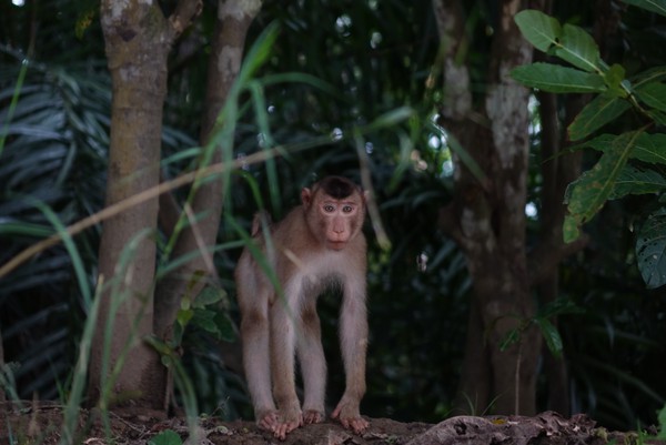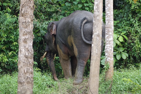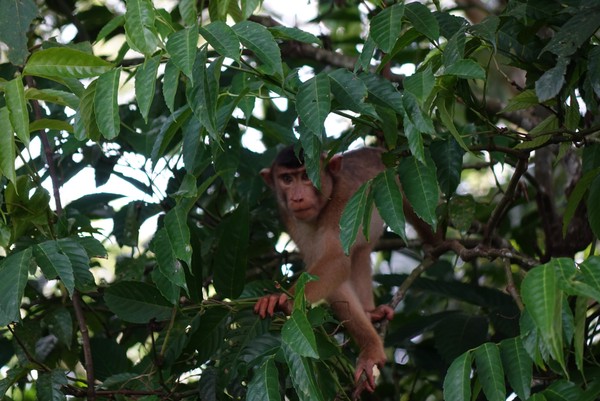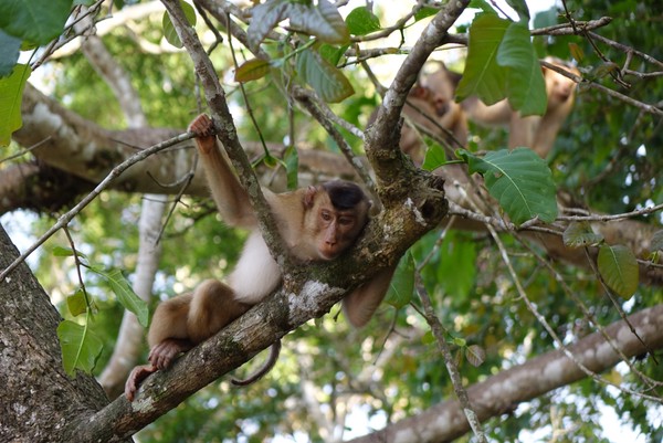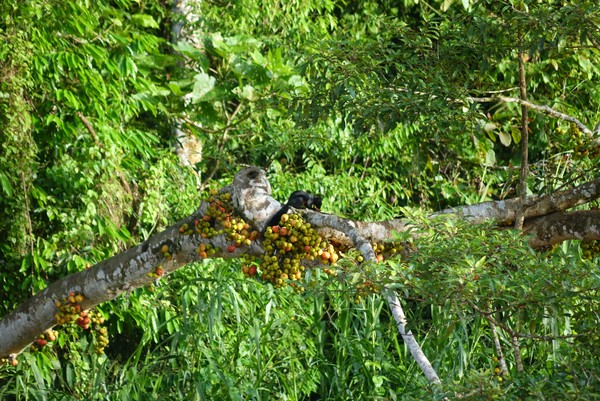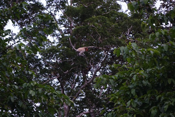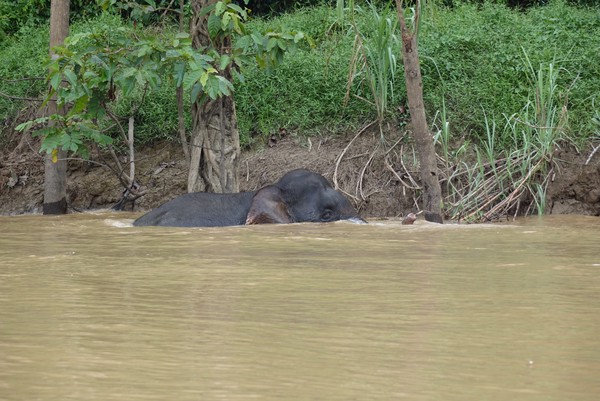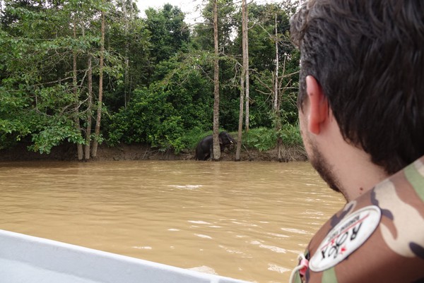 We waren lekker optijd voor de teatime en zagen een ander stelletje zitten. Ze bleken ook Nederlands en we maakte een praatje tijdens een hapje en een koffietje. Om vier uur begonnen we met de tweede middagcruise. Het klikte leuk met het Nederlandse stel en tussen het wild spotten door, hadden we leuke gesprekken. Neusapen, Langur apen en natuurlijk de makaken kwamen langs. Ryan wilde na vijftien minuten upstream varen omdraaien om misschien meer kans downstream te hebben voor de olifant. Hij draaide de boot en zei bijna direct daarna “ELEPHANT!”. We zagen in de verte wat gespetter, maar hadden niet meteen de realisatie dat het daadwerkelijk een olifant was. We kwamen dichterbij en konden hem goed zien. Het was een jonger mannetje en hij was alleen. Hij nam een bad en klom daarna weer de kant op, wat een tof gezicht. Dit is een Pygmy olifant en zijn een slag kleiner dan de aziatische olifant, maar alsnog een prachtbeest om te zien! We hebben er rustig naar kunnen kijken en in ons op kunnen nemen. We hadden allemaal een euforisch gevoel, Tessa en Sjoerd vallen direct met hun neus in de boter! Vlak erna spotte Ryan een krokodil van zo een drie meter, waar we een lange tijd naar hebben gekeken. Ook konden we een dik kwartier genieten van een groep kortstaart makaken, die aan het spelen, eten en aan het chillen waren. Super middag weer! En als klapper kregen we nog een glimp te zien van de Rhino Hornbill, man wat is dit genieten!! O en dan vergeet ik bijna dat we een primeur hebben gezien, namelijk Sylvia, dit is een kruizing tussen een Neusaap en een Langur. Eerst herkende we het niet, maar toen ze ging bewegen zagen we heel duidelijk kenmerken van beiden apen terug bij Sylvia (hoe ze genoemd is door degene die haar ontdekt heeft). Ryan vertelde dat hij haar maar een paar keer gezien heeft in al die tijd dat hij hier werkt, dus dat was echt een leuke treffer.