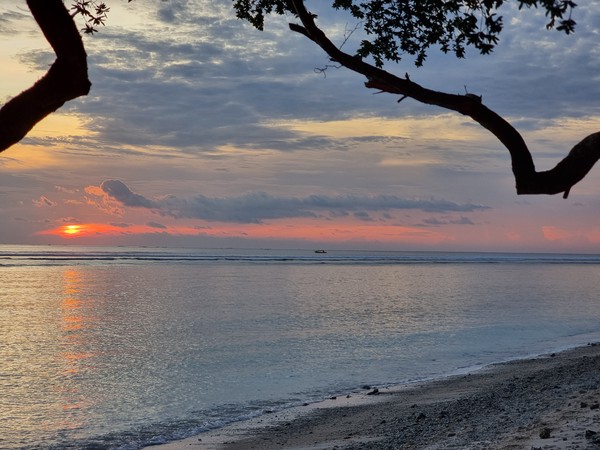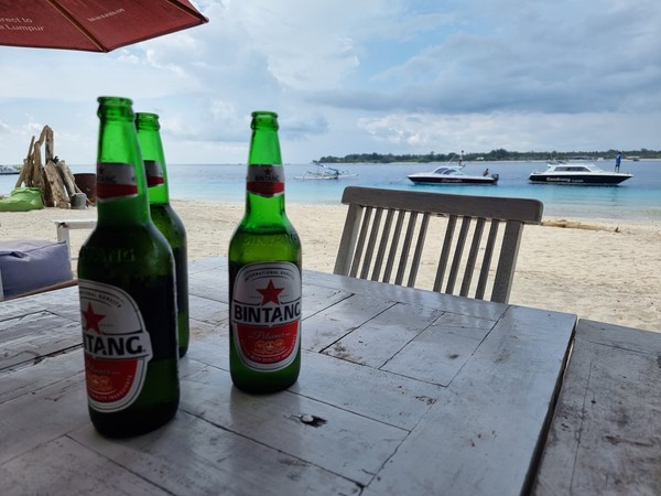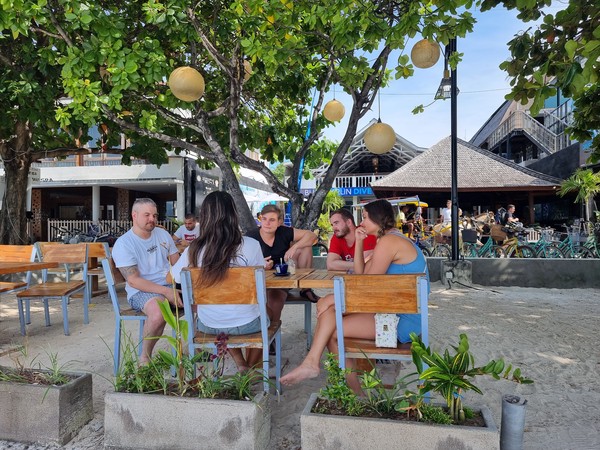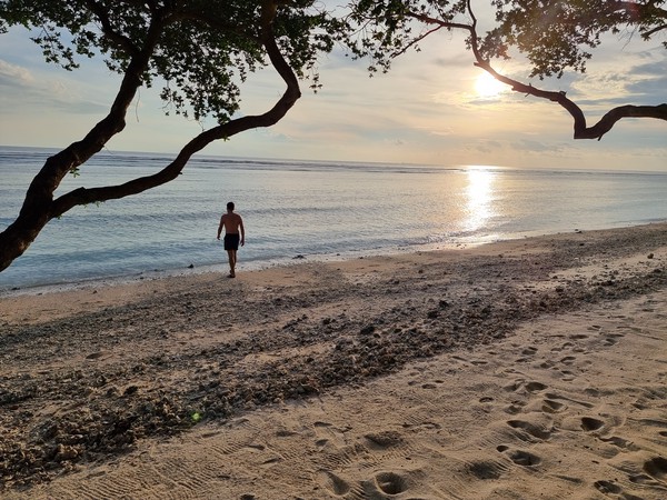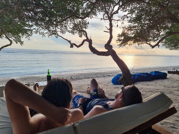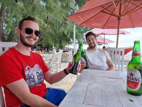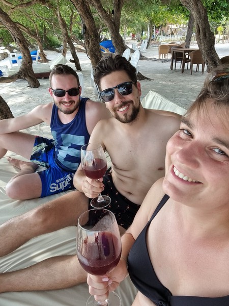 Op het eiland werden we opgewacht door iemand van het guesthouse waar we verbleven. Een klein stukje lopen met de warme tassen op de rug liet ons er al uit zien alsof we gezwommen hadden. Dus we besloten, na een super vriendelijk en warm welkom, ons om te kleden en aan het strand een drankje te doen. Zo gezegd, zo gedaan! We hebben uiteindelijk wel 2 a 3 uur gewoon aan het strand gezeten. Pizza’s besteld, bier gedronken en over van alles en nog wat gekletst en natuurlijk een heerlijke duik genomen. Het was een top middag, waar we alle drie erg van hebben genoten. Na onze ontspanning liepen we naar een goed aangeschreven duikschool om te vragen wat de opties daar waren. Richard wilde graag duiken en we wilde kijken of dit gecombineerd kon worden met snorkelen. Dit deden ze hier niet echt, maar ze raadde wel een ander operator aan om daarmee te gaan snorkelen. Richard kreeg het nummer van haar, om op die manier misschien voor later wel een duik vast te kunnen zetten. We hebben uiteindelijk een snorkeltrip voor de volgende ochtend vastgezet. Na ons te hebben opgefrist hebben we het laatste gedeelte van de zonsondergang gezien en lekker met elkaar gegeten.