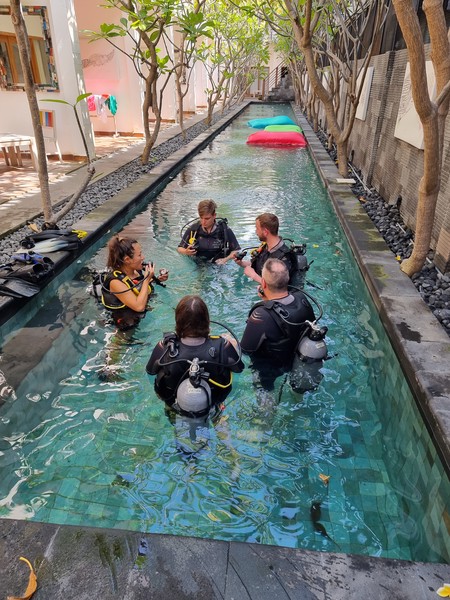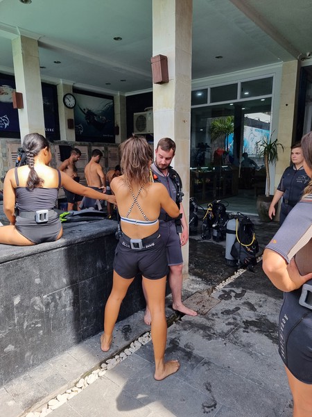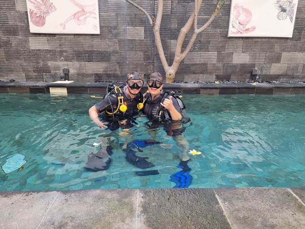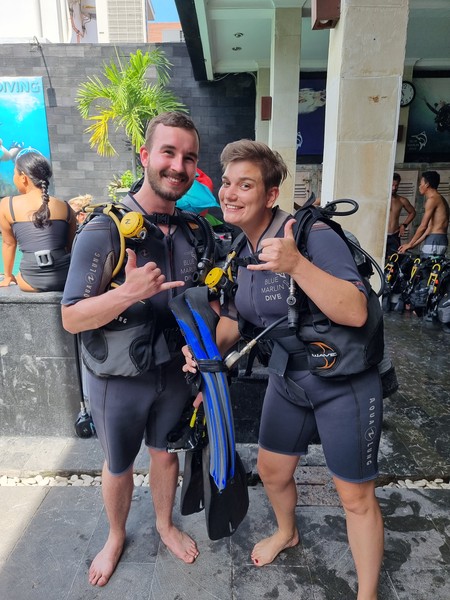 Deze dag was het dan zover, Hilde vind het nog steeds erg spannend, maar door alle goede verhalen van Richard en het duikresort in Mabul moest het er een keer van komen. Nu samen met Peter, wat het wel echt een toffere ervaring maakt. Nu kan je het delen met elkaar. We begonnen met weer een heerlijk ontbijt in een van de goede koffietentjes hier, om vervolgens bij de duikschool ons te melden en te beginnen met het theoretische gedeelte. We hadden nog twee andere mensen die mee gingen doen met deze proefduik. Een jongen uit Duitsland, samen met zijn vriendin uit Hongarije. Het meisje vond het heel spannend, dat zag je aan alles. Peter en Hilde hadden gezonde spanning en daarom wel misschien soms iets wat te veel lol. Tja… de spanning moet er toch op een bepaalde manier uit! ;) Na de korte en duidelijke theorie achter verschillende gebaren, hoe te klaren en de uitleg hoe en wat we allemaal gingen doen, gingen we de uitrusting passen en aantrekken. In het zwembad leerde we hoe we rustig konden ademen, hoe we het masker konden klaren en hoe we onze mondstuk voor lucht altijd weer terug konden vinden wanneer deze op wat voor manier dan ook uit je mond zou raken. Peter en ik slaagde met vlag en wimpel en hebben samen nog wat geoefend met het zwemmen. We waren zo enthousiast dat we het helemaal miste dat het stel ermee stopte. Het meisje was te oncomfortabel in het water en met het ademen onder water raakte ze in paniek.