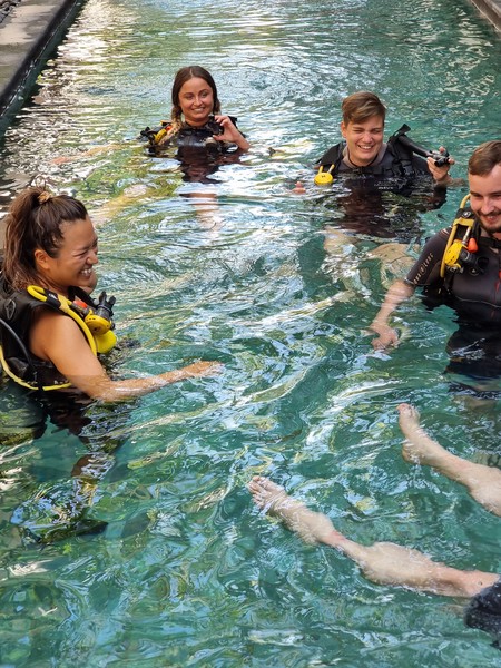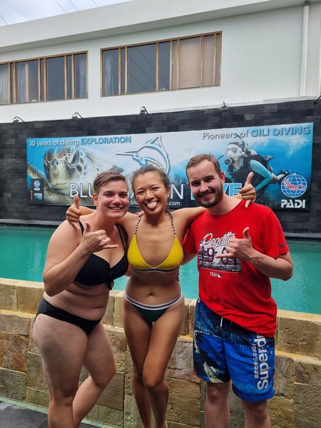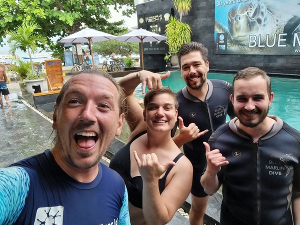Wij gingen ook het zwembad uit voor een lunchbreak, om daarna met het echte werk te beginnen. Richard heeft ons heel de tijd kunnen volgen en foto’s kunnen maken tussendoor. We lunchte dus met zijn drieën en gingen ook met elkaar de boot in om naar de duikplek te gaan. Alleen dook Richard met andere mensen en dieper dan ons. Achteruit lieten we ons het water in vallen en toen begonnen we met het dalen… Dat ging bij Peter een stuk soepeler dan bij Hilde… Hilde had voor dat gedeelte al wat meer spanning, de druk op haar oren was zeer aanwezig en gevoelig. Ze moest dus mega veel klaren en daardoor was ze veel meer geconcentreerd op dit gedeelte dan op het dalen. Maar eenmaal diep genoeg ging het super, we konden los zwemmen. Peter die steeg elke keer weer, waardoor hij de hand van de instructrice beter vast kon blijven houden. Maar Hilde lukte het redelijk om met de diepte te spelen en daardoor vrij te zwemmen. En wat was dat geweldig, alsof je in een groot aquarium zit! De rust, het alleen luisteren naar je ademhaling en al het mooie onderwater leven om je heen. Wat een super toffe ervaring was dit! Op de boot deelde we de ervaringen met Richard en ook Richard had een super mooie, rustige en fijne duik gehad. En alle drie weer meerdere schildpadden gezien! Zo tof om dat op deze manier met elkaar te kunnen delen!