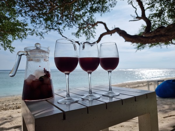 Met elkaar ontbeten we weer bij het lekkere tentje en ging Richard op pad voor zijn duik. Hilde zat er helemaal in en schreef nog twee brieven naar scholen en Peter die ging lekker wat dingetjes uitzoeken. Toen Richard terug was, van een pittige duik met veel stroming, hebben Peter en Hilde zich ingeschreven om morgen een Discovery Scuba Dive te doen. Verder hebben we de fiets gepakt om lekker een rondje over het eiland te maken… Op het eiland rijden geen motorvoertuigen en dat maakt het heerlijk rustig, maar soms ook uitdagend… Want geen voertuigen, betekent ook geen goede weg. Hahha, soms moesten we dus echt even afstappen, omdat het niet te doen was om door dat mulle zand van het strand te komen. We hebben lekker gelucht en uiteindelijk ergens op een strandbed neergeploft om daar wat tapas, Sangria en bier te nuttige… Ja we passen ons slecht aan, aan het heerlijke relaxte eiland leven! ;)