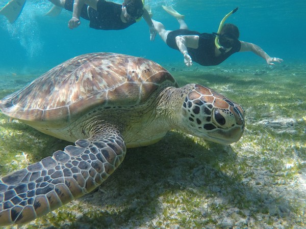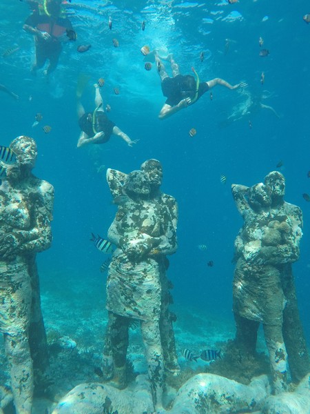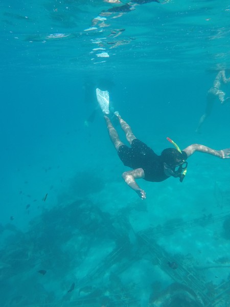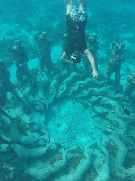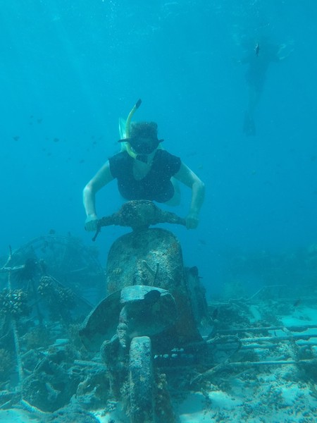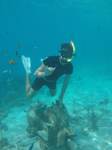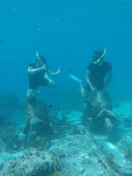 De volgende ochtend hadden we een hemels ontbijtje te pakken en liepen we daarna door naar het snorkelen. Voor Peter een nieuwe ervaring en dat was zeker leuk om dat op deze manier te kunnen delen. We hebben weer allerlei soorten visjes gezien en (ja ja, ook weer!) schildpadden! Dit keer had de snorkelinstructeur een gopro bij zich, waardoor alles vastgelegd kon worden. Ook hebben wij heel erg geoefend met freediven. Dit is duiken met de snorkel op, wat nog knap lastig is. Maar als je het eenmaal onder de knie hebt is het super leuk om te doen en erg leuk om steeds dieper proberen te komen. Het water werkt je knap tegen en je moet tussendoor je oren klaren, maar het is echt leuk om te doen. Daarnaast waren we ook op plekken waar standbeelden in het water stonden en scooters, waardoor je op die manier er dichterbij kon komen en kon doen of je op een scooter zat.