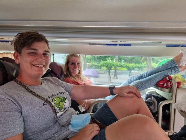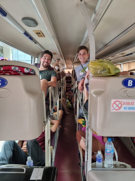 Maar voordat we met de bus kunnen moeten we eerst geld regelen. We hebben net al gepind, maar we hebben alleen briefjes gekregen van 500.000 Dong, de Vietnamese valuta. We horen dat de bus ons 6.000 dong per persoon gaat kosten. Dat gaat niks worden natuurlijk. Dus we besluiten om even snel een paar kipnuggets te halen bij de Burger King (lekker lokaal) zodat we wat kleiner geld hebben. Terwijl we aan het wachten zijn op onze 6 kipnuggets, beginnen mensen opeens de bus in te stappen! Richard loopt al naar de bus om die tegen te houden als dat nodig is en Hilde seint naar de werknemers of het eten er al aankomt. Gelukkig komt het goed, het eten is er snel en we stappen met al onze spullen de bus in. We krijgen een kaartje van de buschauffeur va 5.000 en we moeten samen 20.000 afrekenen, blijkbaar omdat we baggage bij ons hebben. Het voelt wat vreemd aan allemaal, maar 20.000 is 80 eurocent, dus we vinden het wel even prima. Met Grab hadden we minstens 10x zoveel kwijt geweest. De vriendelijke meneer die ons had geholpen zit ook in de bus en verteld ons ook waar we er uit moeten, en vanaf daar is het nog maar een klein stukje lopen. Eerst even de kipnuggets opeten, want die zaten natuurlijk te stinken in Richard zijn tas omdat we moesten haasten… Maar, gelukkig regent het een stuk minder hard nu!