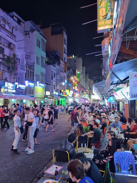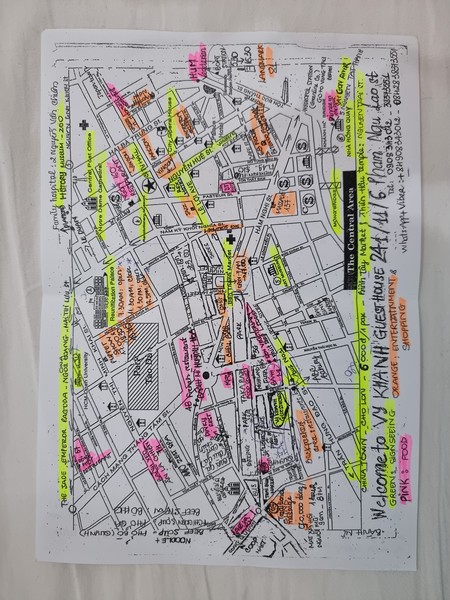Om bij het Guesthouse te komen moeten we door De uitgaansstraat van Ho Chi Minh City lopen, en dit is al een ware belevenis opzich. Hard geluid, allemaal mensen die je aandacht proberen te trekken, en ook letterlijk aan je arm trekken om je ergens naar binnen te krijgen. Personal space is iets wat ze in deze straat in ieder geval niet erg kennen. We lopen een zijstraat in en vragen ons steeds meer af of we wel een goede keuze hebben gemaakt met het Guesthouse. Maar wat was dat een fijn plekje toen we aankwamen. De vrouw van ons Guesthouse (Vy Khanh Guesthouse) liet ons zitten, zette lemon ice tea voor ons neer en neemt samen de kaart van de stad door. De kaart is handmatig ingekleurd met markeerstiften, per categorie een kleur, om duidelijk te maken wat er allemaal te doen is daar. Van attracties tot eettentjes, alles word even benoemd. Ook heeft onze kamer airco, terwijl dat niet online stond, dus wij zijn helemaal blij en boeken gelijk een 2de nacht er bij.