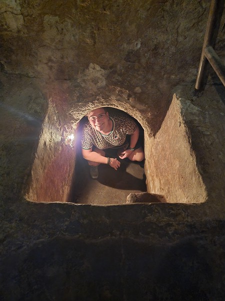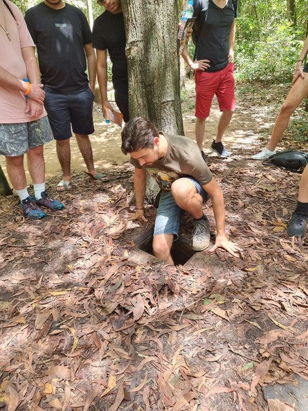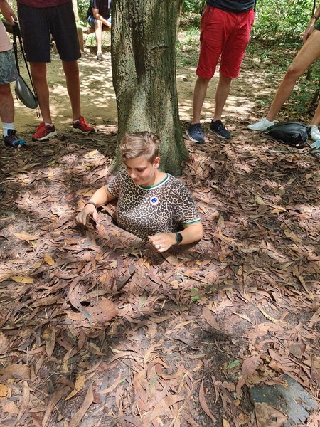 Even later stappen we de bus in met z’n drieen, en nog een hoop andere toeristen. Daarnaast rijden we nog wat rond om van verschillende plekken meer mensen op te halen, tot de bus volledig vol zit. Het is een uur/anderhalf uur om op de plek van de tunnels te komen. We stoppen onderweg nog bij een kunst gallerij die onderhouden word door mensen die geraakt zijn door de oorlog, en gehandicapped zijn geworden. Het was mooi om te zien wat hier gemaakt werd, maar het was vreemd om hier opeens uitgeladen te worden met je busje, met het idee dat je daar spullen koop. Wij hebben hier zelf niets meegenomen, omdat het vreemd liep maar ook omdat we gewoon niet veel plek hebben in onze backpacks.