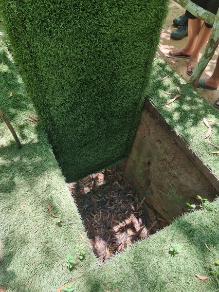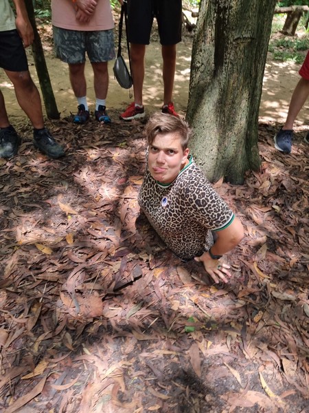 Na de kunst gallerij is het nog een half uur tot de tunnels. Dit zijn een van de vele originele tunnels die gebruikt zijn tijdens de vietnamese. Het is onvoorstelbaar hoe dit werkte in die tijd, en ook hoe redelijk recent dit nog is, iets waar we in Cambodja ook al tegenaan liepen. De ingang van de tunnels zijn 60 bij 40 centimer, en aan de binnenkant van de tunnels is het niet heel veel groter. In de originele tunnel die je als eerste zag mocht je alleen proberen om in te verdwijnen, niet in te lopen. Hiervoor moest je er in gaan staan, de deksel recht boven je hoofd houden, je schouders een beetje naar mekaar buigen (omdat het niet erg breed was) en door je knieen gaan om naar beneden te zakken. Dit was al nauwelijks te doen voor ons. Verderop waren er verschillende voorbeelden van vallen die gebruikt werden door de Viet Cong, vaak gemaakt van bamboo of metaalresten. Het was bizar om dit zo te zien. Later bij de tour op dat terrein had je ook de mogelijkheid om met geweren te schieten. Je had de keuze tussen de M16, AK-47 en een chinees wapen. Het leek ons allebei wel interessant om een keer met een groot wapen te schieten, maar om dat op zo’n plek als dit te doen, een herdenkingsplaats van de vietnamese oorlog, had toch een vreemd gevoel. Aan het einde van de tour mochten we zelf door de tunnels heenlopen. Dit waren niet de originele tunnels, omdat die de aanvoer van toeristen niet aan zouden kunnen. Ook zijn deze nieuwe tunnels een stuk groter. Nog steeds kon je hier niet in staan en moest je volledig door je knieen, schuivelend door de tunnels heen. Wij hebben met zn drieen als enige van de groep de volledige 100 meter van die tunnels doorkruist, die aan het einde ook steeds smaller werd. Heel vreemd, maar aan het einde stonden er mensen te klappen toen we er uit kwamen, we weten eigenlijk nog steeds niet waarom..