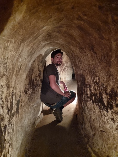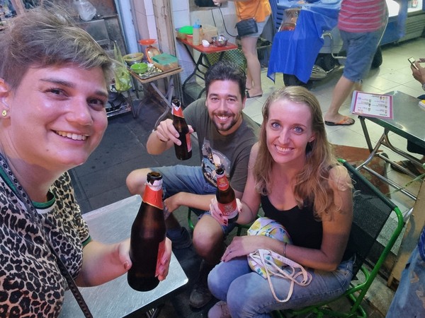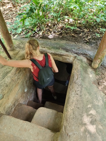 Deze avond eten we bij de noodle zaak die onze host heeft aangeraden als de beste noodles van de stad. Hier ontmoeten we Linda weer, die we voor het laatst gezien hebben in Phnom Penh, Cambodja. We eten gezellig samen, praten weer bij over de afgelopen maanden en gaan de drukke uitgaan straat in. Ook deze keer worden we weer flink lastig gevallen en kiezen we er uiteindelijk voor om een semi rustige plek te pakken aan deze drukke straat en een biertje te drinken. Bier kost hier overigens bijna niks, het is maximaal een euro of zelfs nog minder. Het is een waar schouwspel wat er allemaal gebeurt en wat voor mensen er allemaal langs komen lopen, wat een drukte en chaos! We zitten nog een maar een paar minuten en opeens breekt er nog meer chaos los! We moeten gaan staan, onze stoelen en tafel worden bij ons weg gepakt en we hebben geen idee wat er aan de hand is. Wat blijkt? De politie was ergens te zien en ze mogen geen stoeltjes op de straat hebben staan, dus worden we verwezen naar stoeltjes die nog op de stoep staan.. We horen van Linda dat die al een tour via haar hostel heeft geregeld voor morgen om naar de tunnels te gaan waar de Viet Cong in schuilde tijdens de Vietnamese oorlog. We vragen gelijk of we ook aan kunnen sluiten met die tour en dat was natuurlijk geen probleem, zo hebben we ook gelijk een activiteit voor morgen.