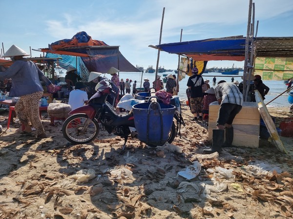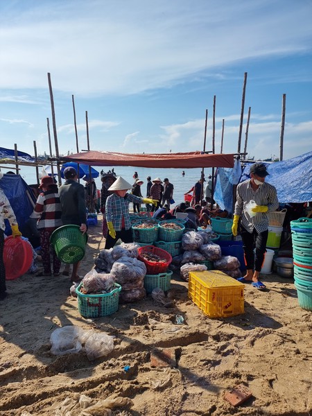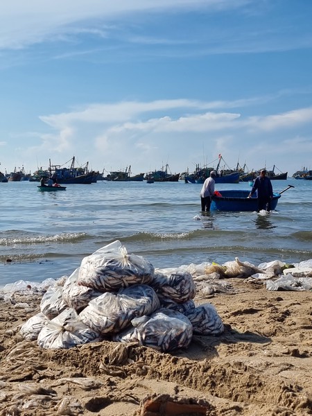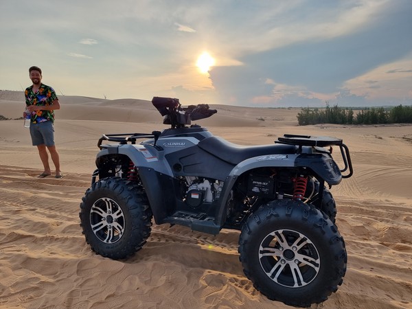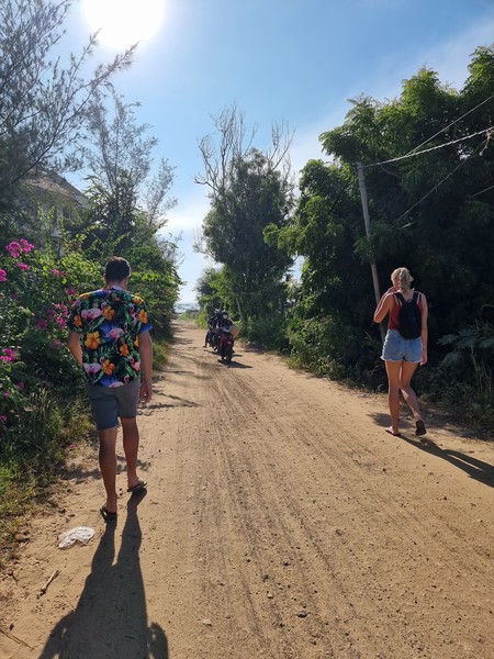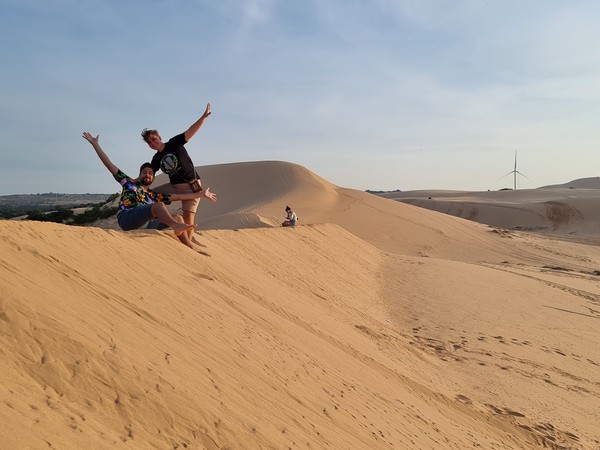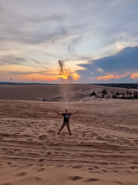 De volgende ochtend hadden we de tour gepland naar de Zandduinen (wit en rood), vissersdorpje en de Fairy Stream. Linda en ik hadden in ons hoofd de duinen van Peru, Huacachina, waar je kan sandboarden en met een buggy door de duinen kan crossen. Onze verwachtingen lagen duidelijk te hoog, de Zandduinen hier in Mui Ne zijn kleiner en worden vooral mooi beschreven. Met een quad werden we naar de top gebracht, wat wel even een leuk ritje was… We zaten met zijn tweeën achterop bij een jongen en Linda zat samen met een meisje die ook alleen was bij een ander achterop. We hebben hier de zonsopgang gezien, wat foto’s gemaakt en vooral gekeken naar hoe andere deze attractie benutten door vele foto’s te maken. Wat wel een leuk weetje is, is dat hier alle Aziatische toeristen altijd hun beste kleren aan doen naar dit soort uitjes en dan een soort fotoshoot met elkaar hebben. Vooral het vervoer naar het andere stukje van de duinen was een heftig ritje. We vlogen over het zand en Richard moest zich goed vasthouden, omdat hij als achterste persoon op de quad zat. Al met al was het even leuk, maar minder dan we hadden verwacht. We bleven positief en hoopte op meer die ochtend, dus met zijn vieren (we raakte aan de praat met Selina uit Zwitserland die bij Linda op de quad zat) aan de milkcoffee en wachtend op wat er komen ging.