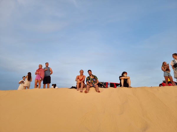 We kregen 3 bedden in dezelfde dorm, wat wel weer even wennen was voor ons. Even bedenken welke belangrijke spullen we op moest bergen en wat we prima konden laten liggen. We gingen ons een beetje mengen in het hostel en dronken een biertje. Tijdens het biertje besloten we dat we morgen niks zouden doen, het is een hostel aan het strand met een zwembadje en het leek ons de uitstekende plek om te niksen. We kunnen hier een tour boeken, waarbij je de bezichtigingen in de buurt kan doen… waaronder hun beroemde zandduinen. We wilde het allemaal in de ochtend doen, maar hadden niet perse de behoefde dit direct morgenochtend te doen. Dus… chilldag morgen en de dag erna de tour en daarna de bus naar Da Lat.