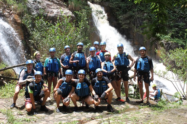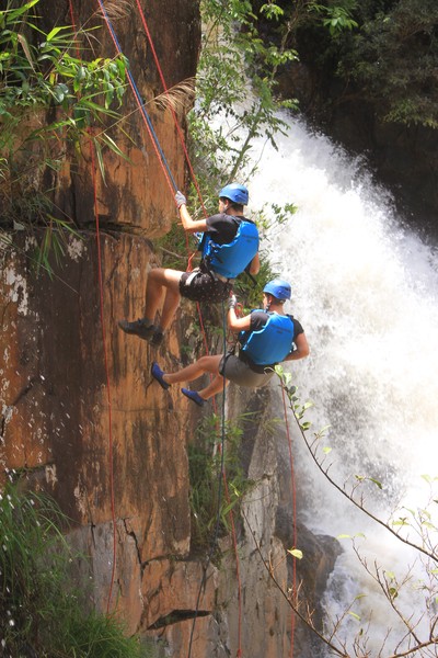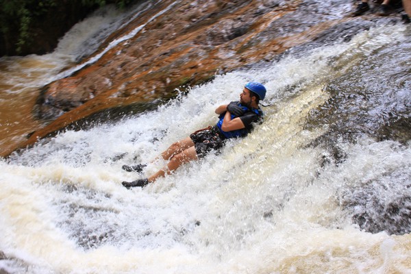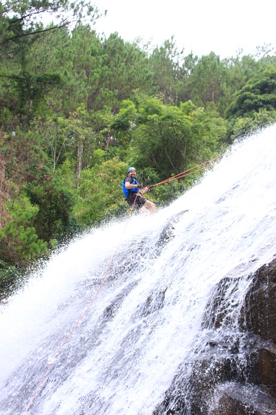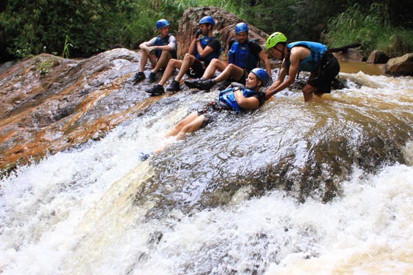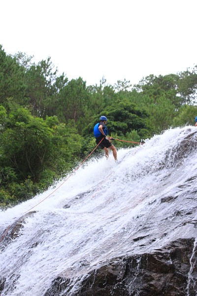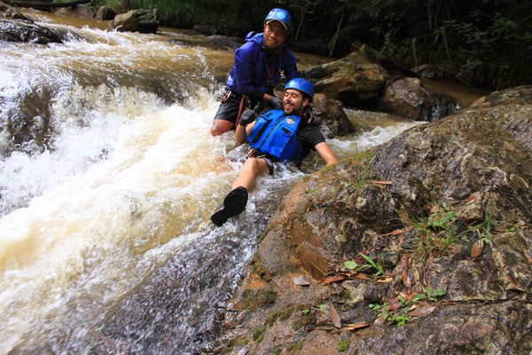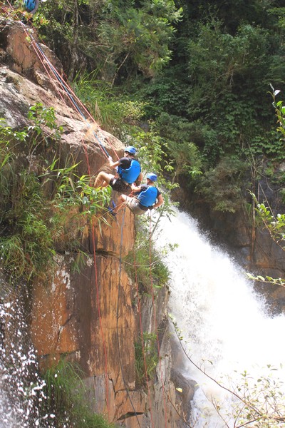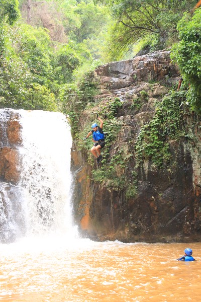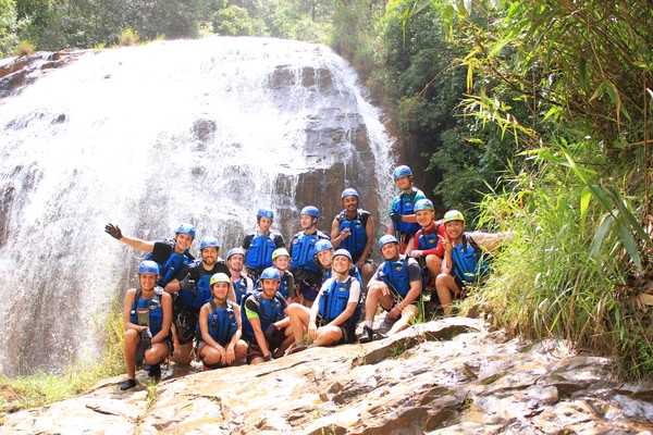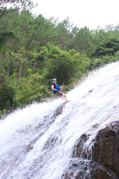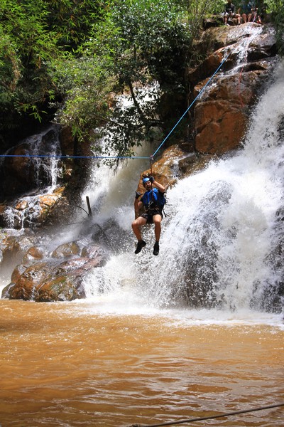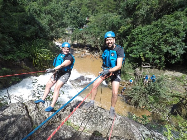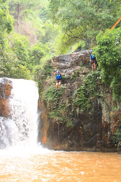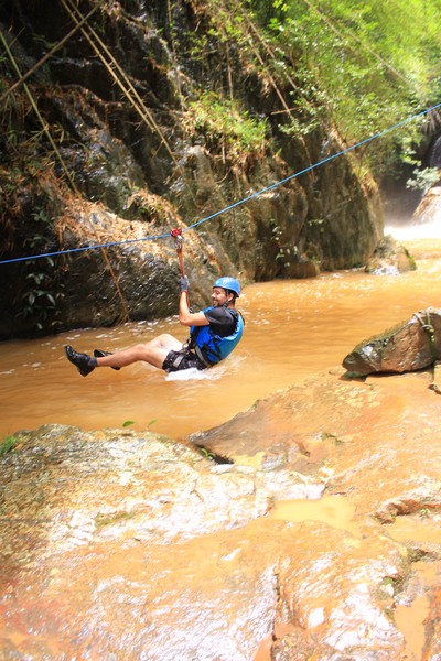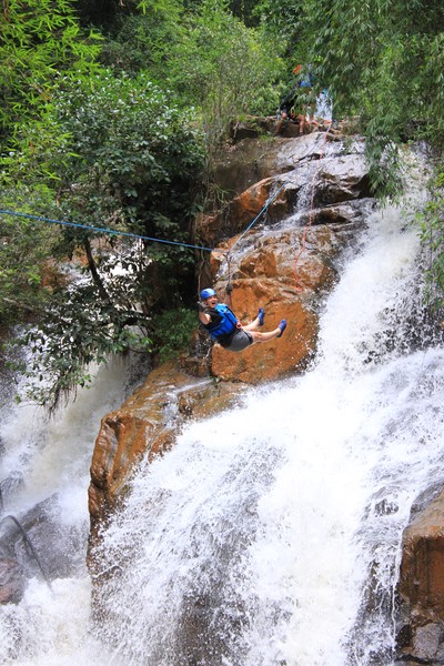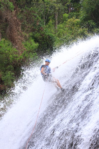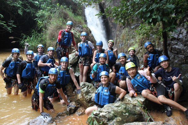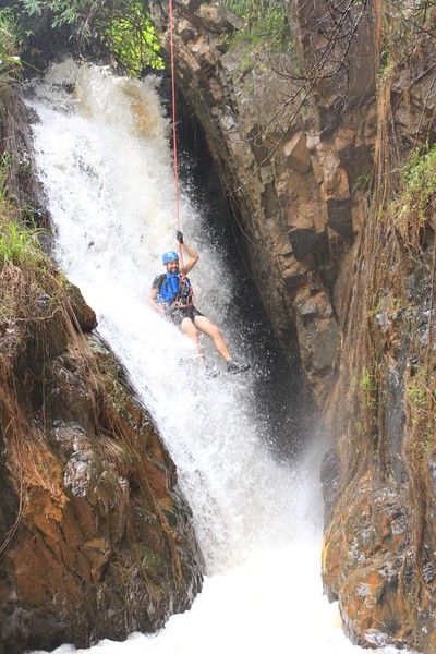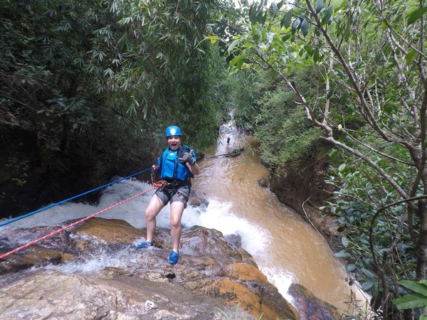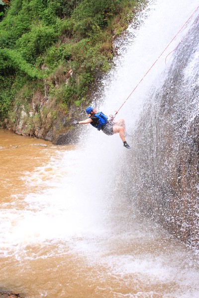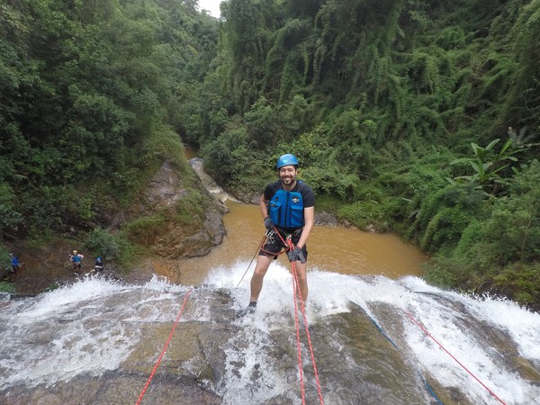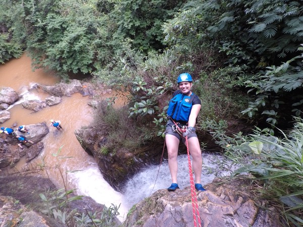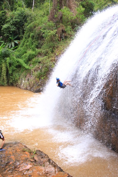 Enthousiast aan het gratis ontbijt, met een ijskoffie en een uitzichtje! Om 8.15 werd er omgeroepen dat de mensen voor de Canyoning moesten verzamelen. We gingen met zijn allen in een busje, wat weer heerlijk op zijn Aziatisch ging. Linda en wij moesten eruit en gingen samen met een guide met een taxi naar de plek, omdat… ja een heel verhaal, maar niet veel logica. Goed eenmaal bij het park werden we in een harnas gehesen, kregen we een helm op de kop en moesten we handschoenen aan. Na een stukje wandelen gingen we het abseilen oefenen op een bossig terrein. Na het oefenen gingen we echt aan de slag. Wat een beetje vreemd was, is dat we tussen de menigte van lokale toeristen heen liepen van waterval naar waterval. Waardoor wij een beetje veranderde in de toeristische attractie in plaats van de watervallen. Na de eerste twee watervallen kwamen we op wat minder bewandeld terrein en werd het steeds toffer om te doen. Met de volledige groep gingen we door allerlei watervallen abseilen, glijden en naar beneden springen. Super gaaf en super tof om deze ervaring met Linda te kunnen delen. Halverwege hebben we een uitgebreide lunch gegeten, wat door de guides werd klaargemaakt. Er lag een groot zeil, er werden broodjes doorgesneden, sla en komkommers en tomaten lagen klaar met daarbij allerlei lekker beleg. Toen we klaar waren bij de laatste waterval, moesten we een flink stuk omhoog lopen en begon het keihard te regenen! Wat een beetje een domper was op de geweldige dag…