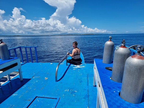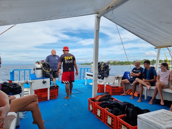 En toen was het tijd voor onze echte duiktocht naar het eiland hier dichtbij. Het is dus een beschermd gebied, wat betekent dat er geen vissers hier mogen vissen en dat er een restrictie staat op de hoeveelheid duikers die daar mogen duiken op een dag. We waren beiden super enthousiast en waren lekker optijd bij de duikschool. Wat volledig onnodig was, omdat onze duikmaster Vernie (waar we eergisteren mee doken) alles al op de grote boot had gebracht voor ons. Dus onze wetsuit, vinnen, boots, BCD en weightbelt. Wat een onrustig gevoel gaf omdat we niks hoefde klaar te maken, maar ook een super relaxt gevoel omdat alles al in orde was.