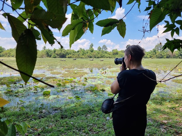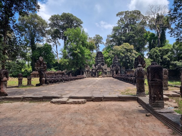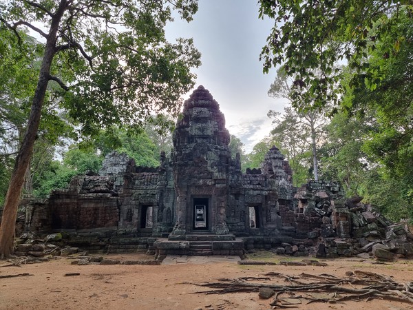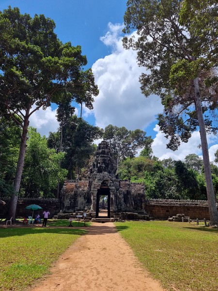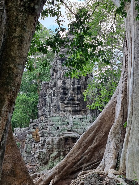 In de loop van de middag begint het helaas flink te regenen dus gaan we ergens zitten om te eten. Ook kopen we (na wat hard onderhandelen) een boek die als gids dient voor deze regio. Nu kunnen we, naast dat we rustig langs de tempels lopen, ook de tijd nemen om te lezen over deze bijzondere plekken. Wanneer zijn ze gebouwd? Wie heeft ze gebouwd? Wat heeft de derde steen bij het 5de gebouw in het midden betekend voor de keizer? Richard leest er rustig doorheen terwijl Hilde zich meer in de omgeving op laat gaan en het probeert vast te leggen op camera. Een heerlijke manier om deze omgeving te ontdekken. Op de terugweg van deze dag rijden we door Angkor Thom heen (het grootste gebied met tempels bij elkaar) en zien we in de verte een glimp van Angkor Wat. Voor nu blijft het nog even een glimp, het bezoeken ervan bewaren we voor de laatste dag.