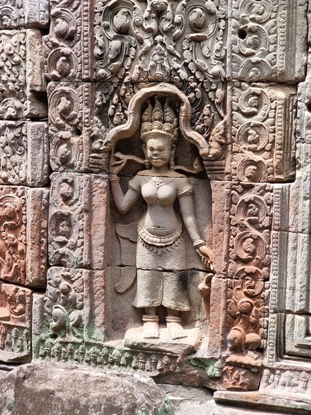 We pakken de scooter weer en gaan naar de volgende tempel. Hier lopen we een meters brede brug over. Aan beide kanten hoofden die ons aanstaren. Aan het einde van deze brug een meters hoge muur, versierd met beelden met een groot detail van verhalen die verteld worden. Er staat een man ons op te wachten om ons wat uit te leggen en later ook foto’s te maken. Het is een officiële medewerker van dat gebied en we laten ons deze keer meenemen. De tempels waren vaak het middelpunt van een dorp of stad, die na de bouw van de tempel ontstond. Grote muren waren de grenzen van de stad, die een veel ruimer gebied bevatte dan alleen de tempel zelf. Nadat we namelijk door de poort zijn gelopen, is het nog minstens honderd meter totdat we de tempel zelf kunnen zien en wat een prachtig plaatje is het weer.