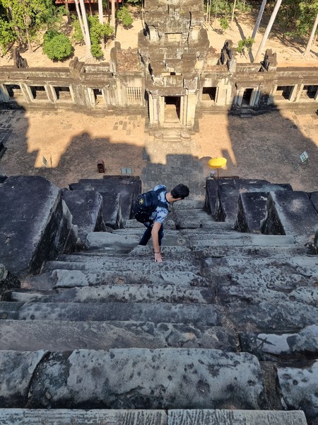 We zijn nog niet helemaal toe aan de grootste tempels, en daarom pakken we deze dag om een tempel verder uit de buurt te gaan bekijken. Dit betekend ruim een uur met de scooter op pad (wat niet super comfortabel is) om deze afgelegen tempel te bezoeken. Dit is geen tempel die gebouwd is in opdracht van een keizer, maar door een belangrijke raadgever van de keizer. Deze tempel is meer versierd dan we tot nu toe hebben kunnen zien. Hele verhalen uit hindoeïstische mythes die hier afgebeeld zijn en in volle glorie te bewonderen. Op de terugweg naar Siem Reap pakken we ook nog even de tempel die we twee dagen geleden niet konden vinden. Dit is een berg tempel, wat betekend dat het een tempel is die vooral in de hoogte is gebouwd. Ook iets wat niet perse rond de 40 graden in de volle zon aan te raden is, maar wel weer een erg mooi beeld opleverde. De treden waren smal en erg stijl, maar je voelt je wel naar een verheven plek stijgen met elke stap.