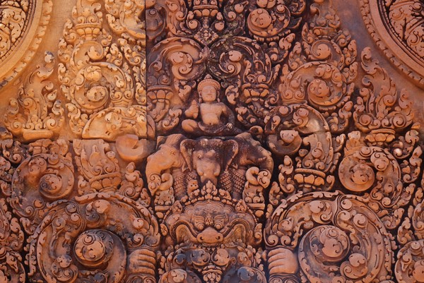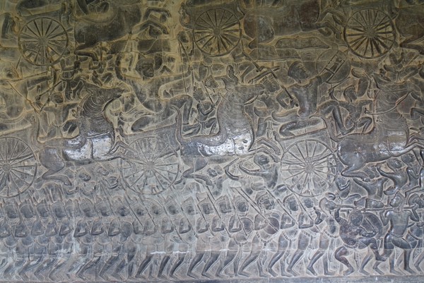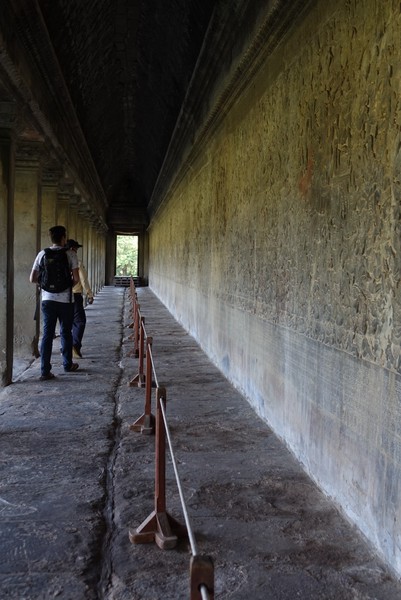Terwijl de gids ons verhalen verteld over het hindoeïsme (op basis waarvan de tempel gebouwd is), en het boeddhisme (naar waar het is omgezet in 1600) lopen we over het brede pad de tempel binnen. Lange muren van tientallen meters (over de gehele lengte van het complex) waarop verhalen verteld worden over beroemde slagvelden en mythische verhalen uit het hindoeïsme. Dit is ontzettend mooi bewaard gebleven en waar nog veel detail in te zien is. Met deze verhalen verplaatsen we ons telkens wat verder naar het midden van de tempel waar we uiteindelijk (na steile trappen naar verschillende niveaus) bij het meest heilige gedeelte terechtkomen waar vroeger alleen de keizer mocht komen. Met elk niveau verbaasd het ons meer en meer hoe groot het eigenlijk allemaal is.