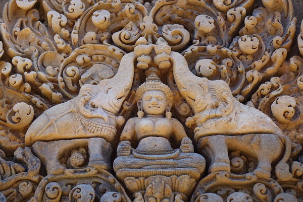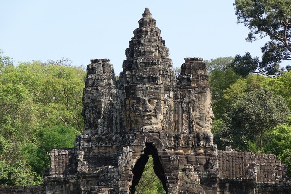 We pakken de scooter weer en gaan naar de volgende tempel. Hier lopen we een meters brede brug over. Aan beide kanten hoofden die ons aanstaren. Aan het einde van deze brug een meters hoge muur, versierd met beelden met een groot detail van verhalen die verteld worden. Er staat een man ons op te wachten om ons wat uit te leggen en later ook foto’s te maken. Het is een officiële medewerker van dat gebied en we laten ons deze keer meenemen. De tempels waren vaak het middelpunt van een dorp of stad, die na de bouw van de tempel ontstond. Grote muren waren de grenzen van de stad, die een veel ruimer gebied bevatte dan alleen de tempel zelf. Nadat we namelijk door de poort zijn gelopen, is het nog minstens honderd meter totdat we de tempel zelf kunnen zien en wat een prachtig plaatje is het weer.