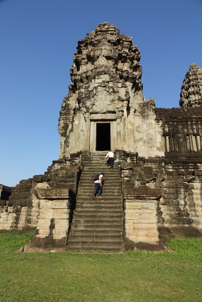 We zijn nog niet helemaal toe aan de grootste tempels, en daarom pakken we deze dag om een tempel verder uit de buurt te gaan bekijken. Dit betekend ruim een uur met de scooter op pad (wat niet super comfortabel is) om deze afgelegen tempel te bezoeken. Dit is geen tempel die gebouwd is in opdracht van een keizer, maar door een belangrijke raadgever van de keizer. Deze tempel is meer versierd dan we tot nu toe hebben kunnen zien. Hele verhalen uit hindoeïstische mythes die hier afgebeeld zijn en in volle glorie te bewonderen. Op de terugweg naar Siem Reap pakken we ook nog even de tempel die we twee dagen geleden niet konden vinden. Dit is een berg tempel, wat betekend dat het een tempel is die vooral in de hoogte is gebouwd. Ook iets wat niet perse rond de 40 graden in de volle zon aan te raden is, maar wel weer een erg mooi beeld opleverde. De treden waren smal en erg stijl, maar je voelt je wel naar een verheven plek stijgen met elke stap.