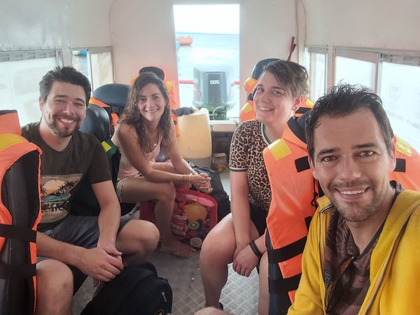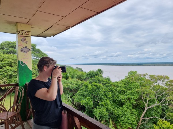 Jazeker we wilde graag nog een derde nacht blijven. Omdat we hierdoor nog meer en nog beter het leven hier en het vrijwilligerswerk wat gedaan wordt in ons op konden nemen. Deze ochtend stonden we om 4.50 op om met een bewoner, Martijn en Belen de rivier op te gaan. En dat gingen we, in het donker gingen we in een nat, lek en klein bootje op zoek naar de roze dolfijnen. Na een stuk varen kwamen we aan bij een soort inham/vertakking van de rivier. Hier ging de motor uit, wat al een ervaring op zich is… de rust en de geluiden van de Amazone komen op die manier volledig tot je. Na een aantal vlugge en verre ruggen/staarten te hebben gezien van deze magische dieren, gingen we weer terug. Op de terug weg gingen we dicht langs de kant, waardoor we veel verschillende soorten bomen, planten en vogels konden bewonderen. Richard, ja dit moet benoemd worden, zat voluit te genieten. Hilde hierdoor nog meer! Wat is het fijn om hier weer terug te zijn en wat vind Richard het interessant en fijn om deze ervaring mee te pakken.