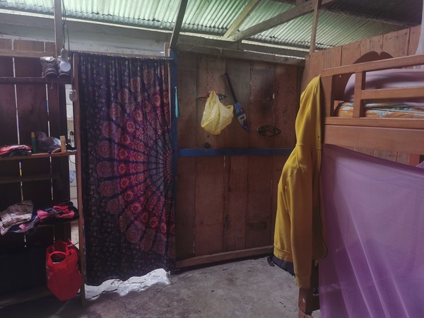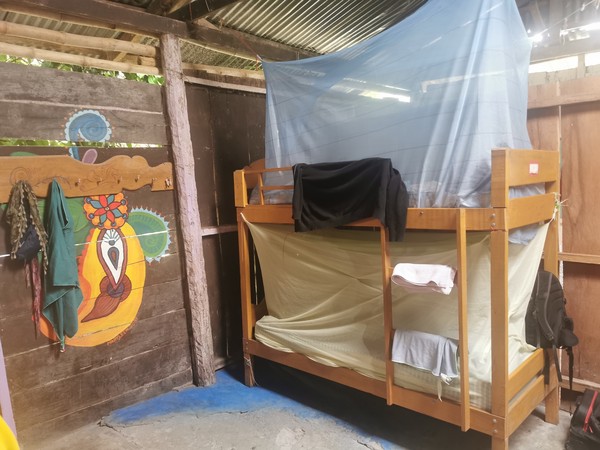 De volgende dag maakte we ons direct klaar om naar de jungle ofwel de ‘Selva’ te gaan. We spraken sowieso 2 nachten af, die we konden uitbreiden naar 3. Rond 12 uur met de motorkaro naar de haven. Daar een snelle boot naar het dorpje Santa Maria De Ojeal wat niet op een andere manier te bereiken valt. Eenmaal daar kregen we een kamer met zijn 4e. Nou ja een kamer… het is aan alle kanten open, maar het was heel fijn een plekje voor ons 4 te krijgen. Er stonden twee stapelbedden in, met elk bed hun eigen klamboe en een doorgezakt matras. Er is nog een kamer met 5 bedden en dan is er nog een huisje buiten waar Andrea, het meisje die dit heeft opgericht, woont. We begrepen dat zij hier al 5 jaar met liefde vrijwilligerswerk doet en pas sinds een jaar een plek heeft met privacy. Verder is er een veranda met 3 hangmatten, een wc waar je kan plassen en doortrekt met een emmertje water, een douche waar je een emmer water over je heen kan gooien en een aparte wc voor de grote behoeftes. Lekker back to basic dus. O en er is een klein keukentje en maar 3 uur op een dag elektriciteit.