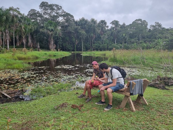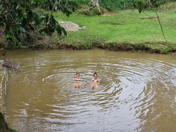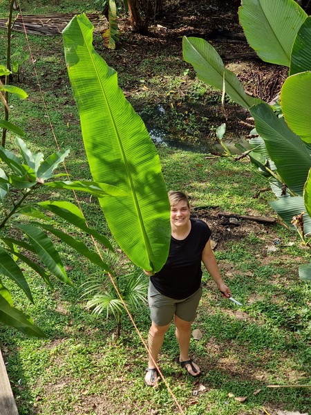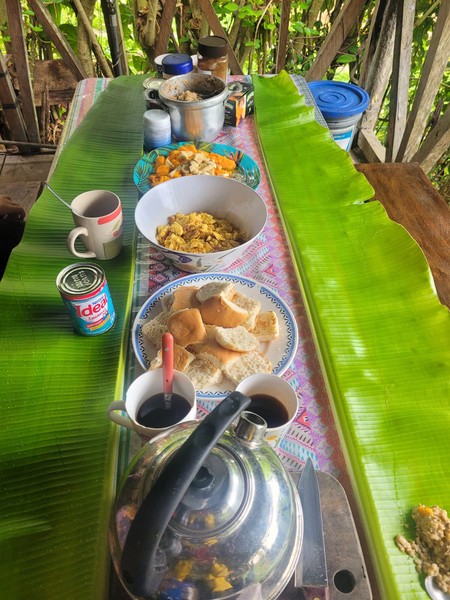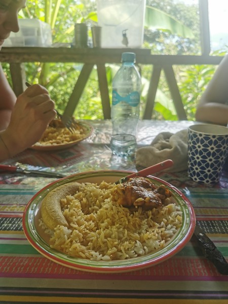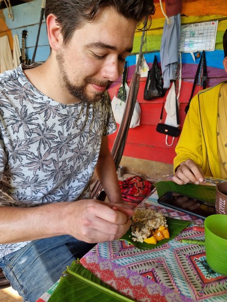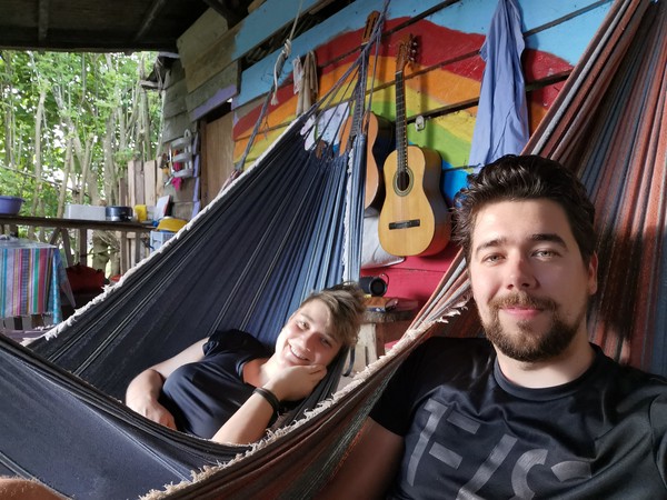Hilde was vroeg wakker en moest naar de wc, na dit gedaan te hebben zag ze dat Richard ook wakker was en gaf ze aan om lekker buiten in een hangmat te gaan liggen. Wat een goed idee, zo werden we heerlijk rustig wakker van alle geluiden en het zonnetje wat steeds hoger kwam te staan. Het ontbijt regelde Belén met Andrea deze ochtend en Hilde haalde een bananenblad van de boom. Dit is de manier hoe zij hier het ontbijt eten, niet van een bord maar van een blad. Omdat er niet altijd even veel water is, is dit zeer waterbesparend omdat het niet afgewassen hoeft te worden. Omdat alles nog vrij nieuw was voor ons deden we deze ochtend rustig aan. Ook om de temperatuur een beetje tot ons te nemen. Niet te geloven dat we 4 dagen geleden nog de Mateo aan het beklimmen waren met sneeuw en kou. Onze ochtend activiteit bestond dan ook uit een duik in de Amazone. Middag eten besteld bij Restaurant Paula, waar (verrassend genoeg) het menu bestond uit kip en rijst. De rest van de middag staat in teken van het vrijwilligerswerk met de kids.