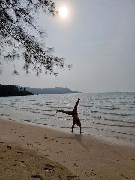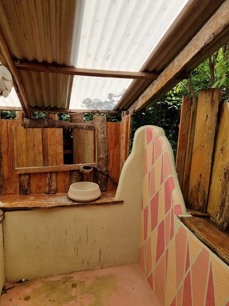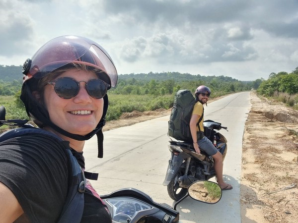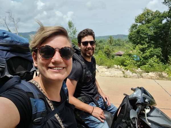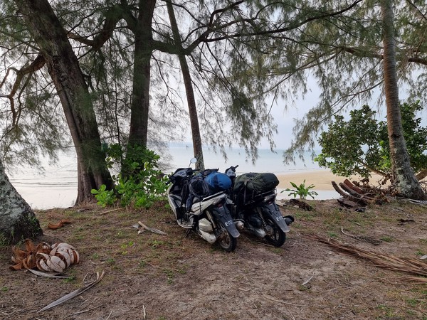 Twee uur (!!) later bereikte we uiteindelijk pas de bungalows. Maar hoe dan? We nemen jullie mee in ons avontuur. We gingen vol goede moed met onze grote tassen op de rug en de kleine tas tussen de benen met de scooter op pad. Het eerste stukje was mul zand en eigenlijk doorstonden we beiden de proef vrij soepel. Daarna een hele lange weg over asfalt en wat voelde het fijn dat we dit hadden aangepakt. Af en toe even op Maps.ME kijken of we nog goed gingen en ook lieve bewoners van het eiland die ons hier en daar even de juiste kant aanwezen. Tussendoor tanken bij iemand thuis met frisdrankflessen met benzine en nog steeds super happy! Na het vissersdorpje werd het asfalt ingeruild voor zandpaden, jungle, kuilen en gaten in de weg en hier en daar net zo mul zand als op het strand. De tocht werd wat zwaarder, maar nog steeds genoten we volop. De tassen werden wel wat zwaarder en inmiddels waren we kletsnat van het zweet, maar dat wilde de pret nog steeds niet drukken. Hoe verder we in de afgelegen paadjes kwamen, hoe minder werd aangegeven waar we heen moesten en hoe minder we snapte waar we heen gingen… Letterlijk waren de bordjes begroeid met takken en moesten we soms weggetjes in slaan die je normaal toch echt over zou slaan om te gaan lopen… laat staan met de scooter. Op een gegeven moment kwamen we aan bij wat bungalows en een verlaten bordje met “parking” erop. Lonely was het… maar zitten we goed? Richard de tassen af en op de scooter gegooid en ging vervolgens op onderzoek uit, terwijl Hilde bij de scooters en de tassen bleef. Niemand bij de bungalows… niemand op het strand… en niemand een stukje terug (als we op maps.me keken, dachten we dat het daar moest zijn) te bekennen. Oke, we waren totaal verslagen en de moed zakte in onze slippers. Tassen maar weer op en een stukje het minimale pad volgen, dat was ons plan! Wat denk je… 10 meter verder, letterlijk 10 meter verder!! Stond er “Welcome” en zagen we iemand lopen. Wauw, dit hadden we niet verwacht! We werden heel lief welkom geheten en naar onze super schattige bungalow, midden in de natuur met verderop de zee, gebracht. We zijn er! Hebben we toch weer mooi samen geflikt. En nu eerst een douche… Naja een bucketshower dan, want deze super mooie en afgelegen plek heeft alleen de basics! Genieten!
