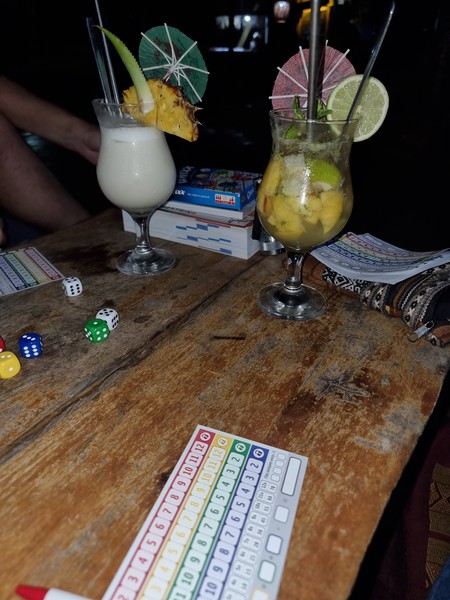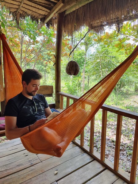 We kwamen op deze plek om helemaal te ontspannen en niks te doen, dat hebben we dan ook heerlijk uitgevoerd, maar toch zijn er nog wel wat verhalen te vertellen. De middag van aankomst hebben we heerlijk spelletjes gedaan en super lekker gegeten. Dat smaakte goed en we zeiden nog tegen elkaar dat dat allemaal wel goed zat voor de aankomende dagen. In het donker terug naar de bungalow, Richard deed het licht aan en we zagen beesten vliegen. O wauw, vleermuizen! Twee ofzo vlogen rond bij het plafond, Hilde kreeg nog net de kans om te zeggen dat ze dat dus vanmiddag rook. Vleermuizen poep! En daar kwamen er nog een stuk of drie of vier rond om ons gevlogen. Oke, beetje paniek en chaos. Wat doe je met vleermuizen op je kamer en kunnen ze kwaad? Weer een aantal die plotseling en vlak langs ons vlogen! Terug naar de bungalow waar het restaurant was en aan Danny (de eigenaar) vragen of dit normaal was. O zegt die, maar dat is heel normaal. Ze zitten in elke bungalow wel, helemaal nu de bungalows al lang leeg hebben gestaan. Ik heb het vanmorgen nog allemaal schoongemaakt en het zijn hele vriendelijke en fascinerende beesten. Je kan heel mooi met je koplamp op in bed gaan liggen en ze volgen, dan komen ze vlak langs je hoofd vliegen en raken je nooit. Ze hebben zo’n mooi systeem… en er volgde nog een heel verhaal over deze mooie dieren. Vooral Hilde zag even de schoonheid van deze beesten niet helemaal in, maar we gingen terug. Eerst samen met Danny die nog even onder de bedden kwam vegen en ons vooral veel plezier wenste, we zitten tenslotte in de natuur!