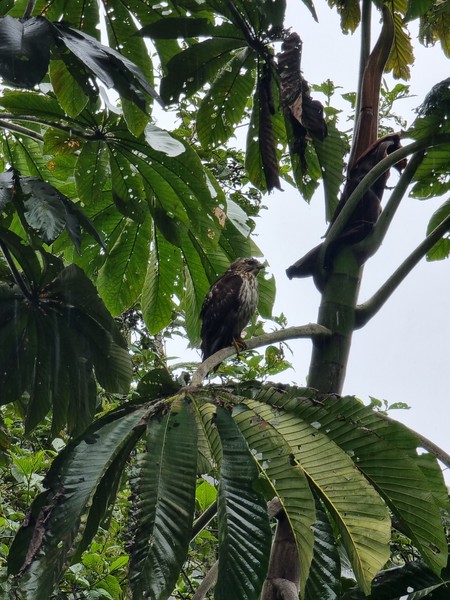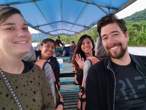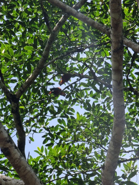 Optijd weer op, om 5.30 in de boot om de papegaaiachtige klei te zien eten. Dit doen ze om hun snavel goed sterk en krachtig te houden. Heerlijk door de verschillende verrekijkers en de vrouw van Darwin ;), de mooie en kleurrijke papegaaien gezien, onder het genot van een mooie lucht achter ons die steeds meer begon te veranderen. Terug voor het ontbijt en na het ontbijt vertrokken we bijna direct weer naar het meer. We hadden hier allemaal nog geen voorstelling van, maar we gingen eerste een stukje met de boot, daarna te voet (met weer veel verschillende planten waar we informatie over kregen en de nodige vogels onderweg) verder naar het meer. Het meer was inmiddels niet helemaal meer een meer, maar meer een smalle rivier tussen allerlei plantengroei (een beginnend moeras). Hier gingen we doorheen op een bamboe vlot, wat een enorme rust en vredig gevoel gaf. Hier ook weer van alles tegengekomen, waaronder een vogel die een zeer bijzonder geluid maakte! Hhahahaa, waar we vooral erg om hebben gelachen (wat we overigens sowieso heel veel hebben gedaan met de groep!).