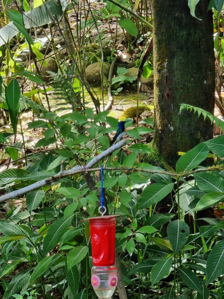 We gingen onze reis rustig verder en we stuitte hier op de eerste wegwerkzaamheden… Top! Hier stonden we een uur vast. De eerste, want na deze kwamen we er nog zo een 3 a 4 tegen. Gelukkig niet allemaal met dezelfde lange wachttijd en daarnaast loste Darwin dit met veel positiviteit op! Een keer lunchen (die we bij ons hadden) bij mensen die wel wat warm water voor ons wilde zetten en een keer rustige wandeling over de weg om wild te spotten. En dat lukte goed, we waren al een aantal mooie vogels tegen gekomen, apen en zeer gekleurde vlinders! Darwin had zijn vrouw (de telescoop), ook bij zich. Hij was hier erg trots op en wij erg blij mee, want dit was een super handige tool om de dieren heel mooi en goed van dichtbij te kunnen bekijken. Hij was er ook super goed in om direct zijn vrouw goed neer te zetten en de dieren prima in beeld te zetten. Aan het einde van deze blog zouden we nog een lijstje van dieren neerzetten die we hebben onthouden en opgeschreven hebben. Nog een klein stuk onderweg, waarbij we soms ineens stopte de auto uitsprongen en zochten naar het dier wat we hadden gehoord, waar we het eten langs de weg zagen liggen of die we vanuit de auto al gespot hadden. Redelijk gesloopt kwamen we bij de eerste lodge aan, waar we met een koud biertje en super lekker eten de dag hebben afgesloten.