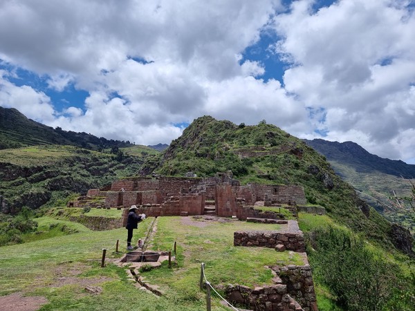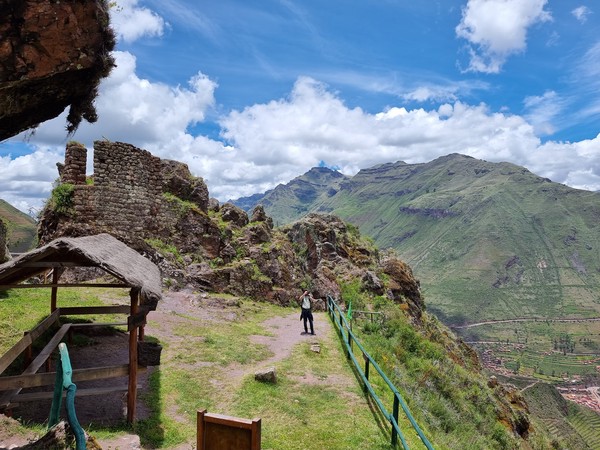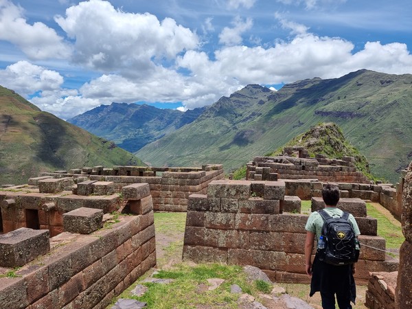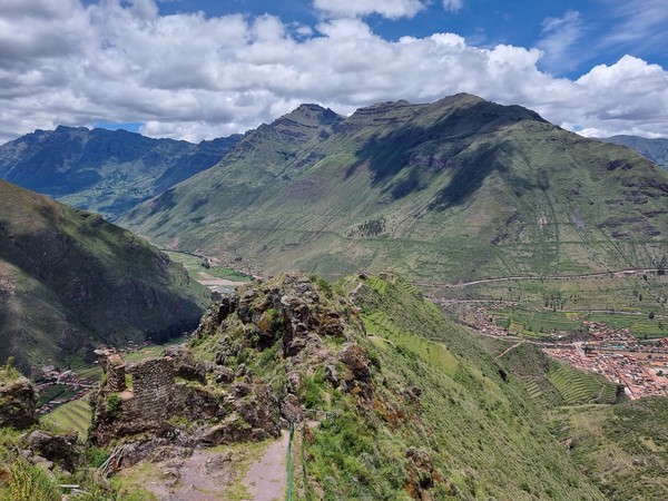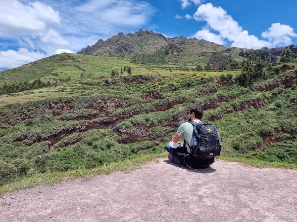 De volgende dag dan toch echt op pad naar de oude Inca ruïnes van deze stad. Deze liggen hoog op een berg, zoals veel Inca ruïnes. We gaan vroeg (omdat dit wordt aangeraden) met de taxi omhoog, met als idee om vanaf daar alles weer naar beneden te lopen. Soepel verliep dit alleen niet, want met de taxi omhoog worden we tegen gehouden. Wegwerkzaamheden. Hier in Peru is dat niet van tevoren bekend, maar loop je daar gewoon tegenaan. We hebben daar 50 minuten moeten wachten, terwijl ons om de 10 minuten wordt gezegd dat het nog maar 5 min is… Het vroeg en optijd boven zijn, werd hierdoor een beetje gedwarsboomd, maar als je je daar aan gaat ergere in Peru… Heb je een zwaar leven! ;)
